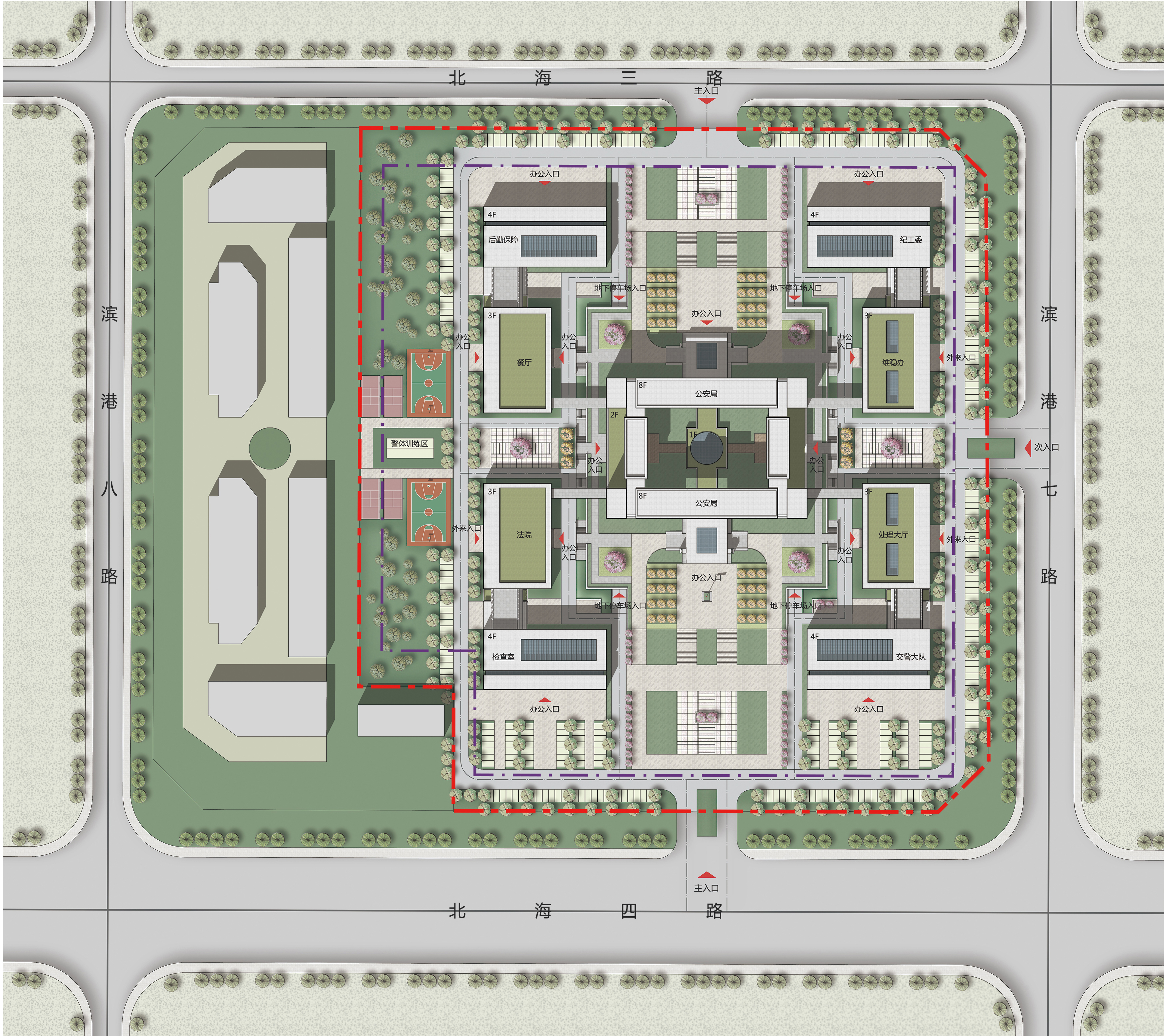建筑形象能夠體現(xiàn)其功能特質(zhì),所謂“浩然正氣”。公安局因其使用性質(zhì)決定了其建筑形象所具有的氣質(zhì)應(yīng)當(dāng)是正直不阿,端莊方正,充分體現(xiàn)以人為本的特質(zhì)是我們在追溯地域文化之后的設(shè)計(jì)目標(biāo),方正大氣的建筑形體符合傳統(tǒng)的審美思維和心理。