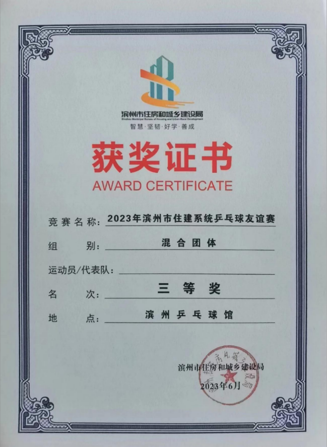 公司榮獲2023年濱州市住建系統(tǒng)乒乓球友誼賽“團體三等獎”