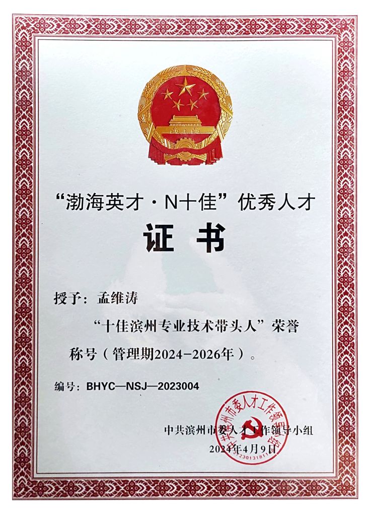 經(jīng)中共濱州市委人才工作領(lǐng)導(dǎo)小組嚴(yán)格評選,公司員工孟維濤榮獲“十佳濱州專業(yè)技術(shù)帶頭人”榮譽(yù)稱號。