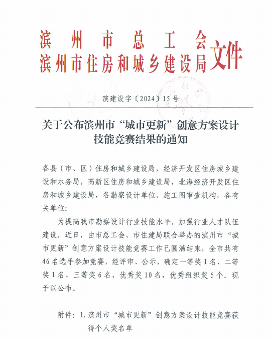2024年10月,在濱州市總工會、濱州市住房和城鄉(xiāng)建設局共同主辦,濱州市勘察設計協(xié)會、濱州建筑工程施工圖審查中心承辦的濱州市“城市更新”創(chuàng)意方案設計技能競賽中,公司員工憑借出色的創(chuàng)意和專業(yè)的技能脫穎而出,參賽的9名員工全部獲獎,囊括一、二等獎,另外3人獲三等獎,4人獲優(yōu)秀獎,公司獲得優(yōu)秀組織獎。本次競賽活動主題為“聚力創(chuàng)新發(fā)展,賦能強市建設—濱州市城市更新設計探索”。